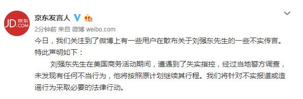 很快,京东官方对此进行了回应,称刘强东在美国商务活动期间,遭遇到了失实指控,将针对不实报道或造谣行为釆取必要的法律行动。