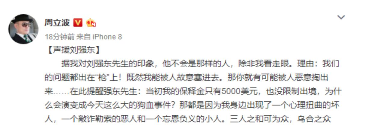 在刘强东陷入涉嫌性侵风波后,周立波在微博声援刘强东。“据我对刘强东先生的印象,他不会是那样的人,除非我看走眼。我们的问题都出在“枪”上!既然我能被人故意塞进去。那你就有可能被人恶意掏出来……”