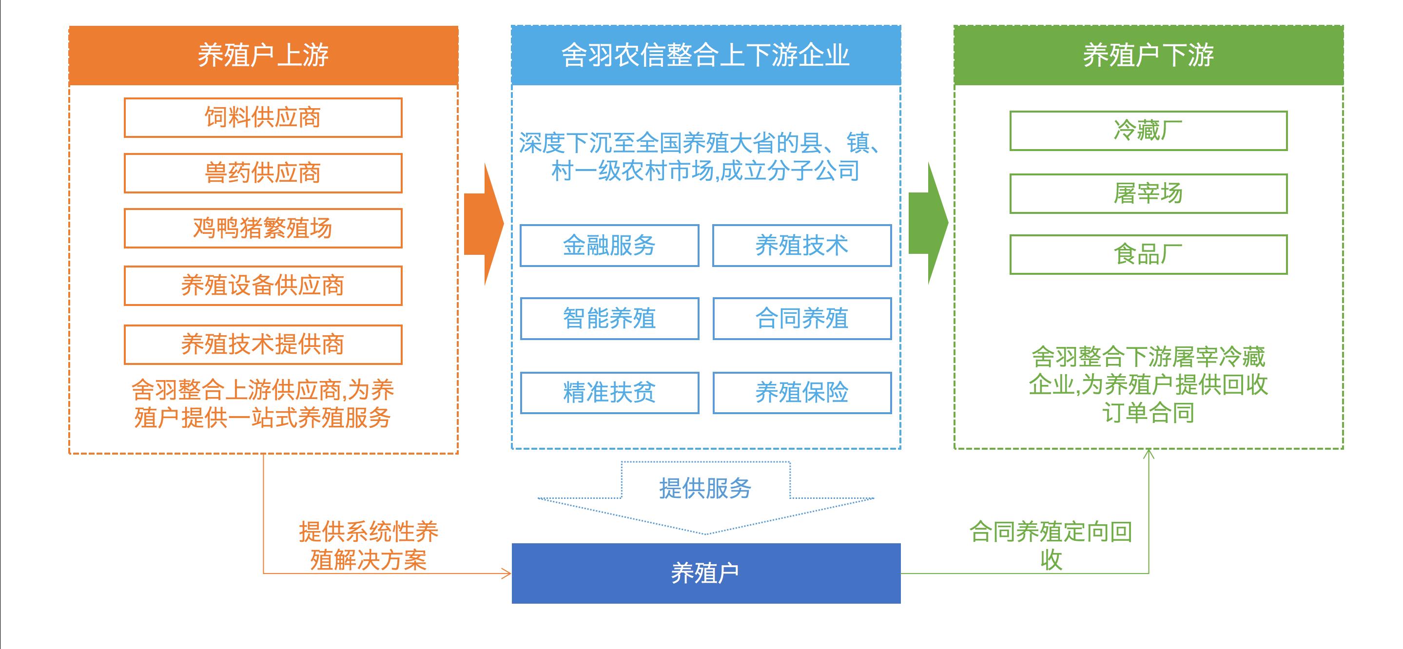 舍羽农信的切入点,就是解决农村中小规模养殖户融资难的痛点。舍羽农信与银行等金融机构合作,依据下游冷藏厂与养殖户签订的代养协议,指导养殖户通过舍羽农信「养殖端APP」在线完成人脸识别、身份信息、养殖信息、借款需求等认证,为养殖户提供「合同鸭养殖贷款」助贷服务。