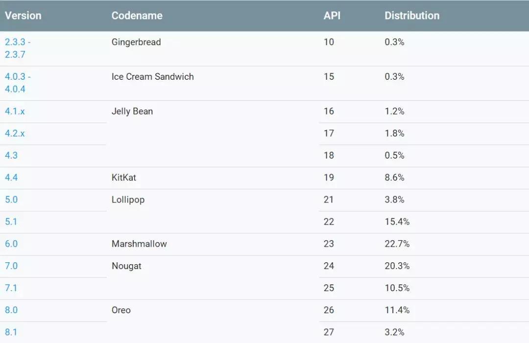 基于此,我们都知晓每个手机制造商都会基于开源的 Android 版本定制优化成适配自家手机的操作系统,要想让全球的用户为躲避该 Bug 都直接升级最新版本,难度可想而知了。且根据 Google 于 8 月 31 日更新的最新 Android 版本市场份额表来看,一个月大的 Android 9.0 根本没上榜,也就意味着它现在的市场份额连 0.1% 都不到。