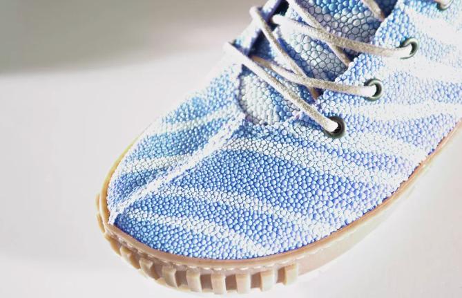 泰国Rayfish Footwear股份有限公司研制的展品是一双“生物定制”的鞋子。它通过提取现存动物物种的着色、图案基因,生产出了「黄貂鱼皮革」,这种材质具有无数种自然生长样式。从基因水平上来说,这样生产出来的任何一双鞋子都是独一无二的。
