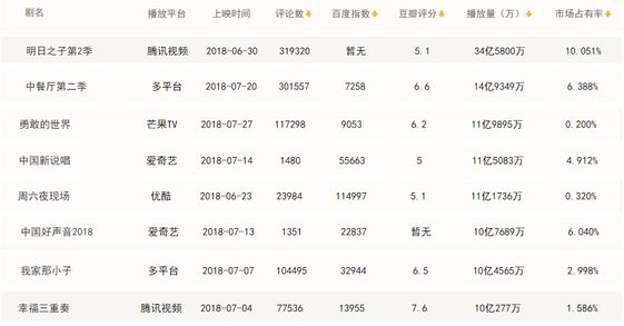 通过上表可以看到,截止至9月4日,2018暑期档播放量破10亿的一共只有8部,总计播放量为115.5亿。其中腾讯视频的《明日之子》最高,达到34.6亿。