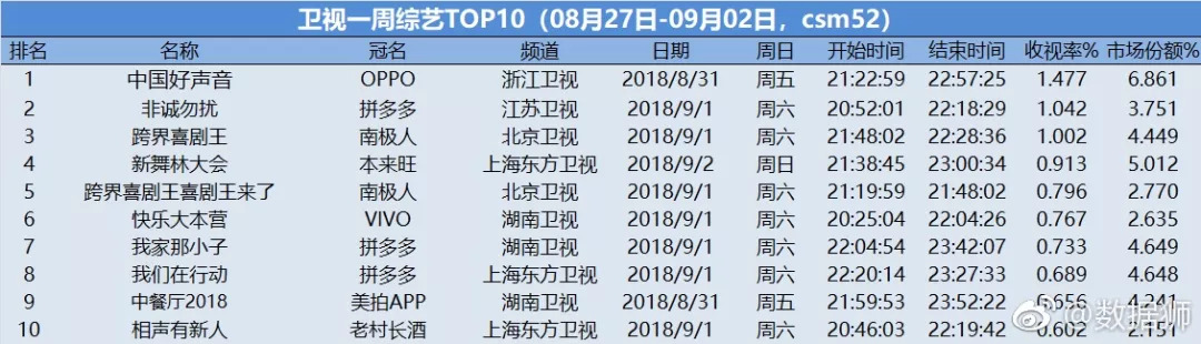 以上周为例,top10中,收视达到1%门槛的节目只有3档。其中表现最好的为《中国好声音》,收视率而1.477%。而《快乐大本营》这种早年“称王称霸”的综艺收视率仅0.76,《中餐厅2018》《我家那小子》等投入顶级资源制作、寄予厚望的综艺,收视表现均在1%以下。