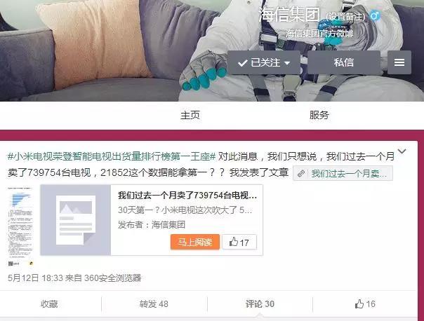 当时这个所谓智能电视网,在行业内本身也不具备影响力,因此该微博发布后,另一家老牌彩电行业巨头海信迅速在微博发布一篇名为《30天第一?小米电视这次吹大了》 文章,对小米电视所谓的出货量第一进行回怼。