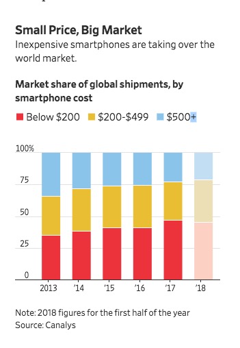 “全球智能机市场已经饱和,但是新兴市场仍在增长,”研究公司Counterpoint分析师塔伦·帕塔克(Tarun Pathak)表示,“争夺下一个10亿消费者的重要性,超过了高端市场。”
