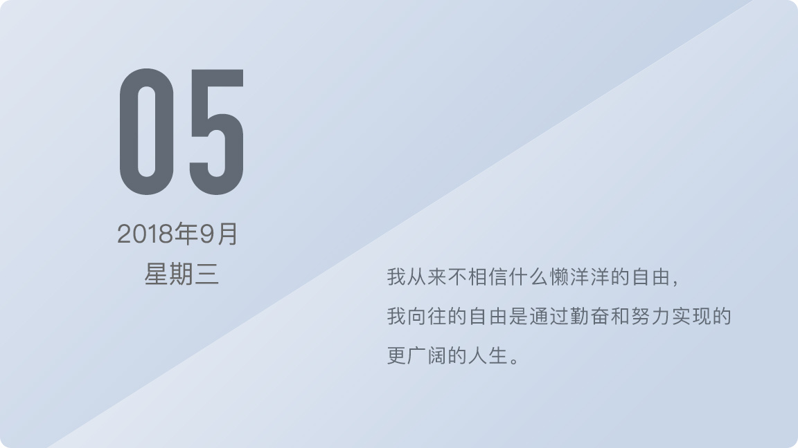 那样的自由才是珍贵的、有价值的;我相信一万小时定律,我从来不相信天上掉馅饼的灵感和坐等的成就。做一个自由又自律的人,靠势必实现的决心认真地活着。