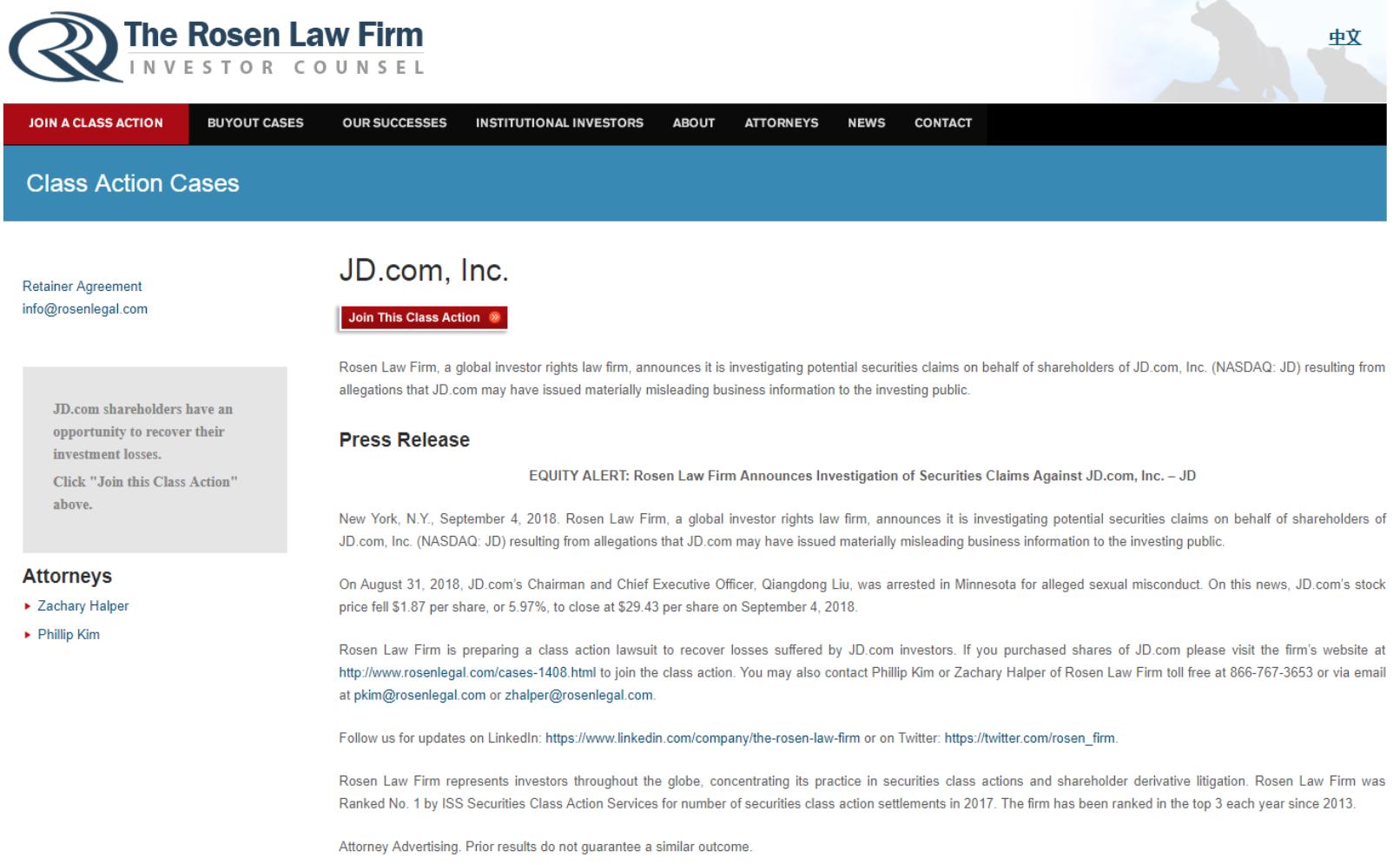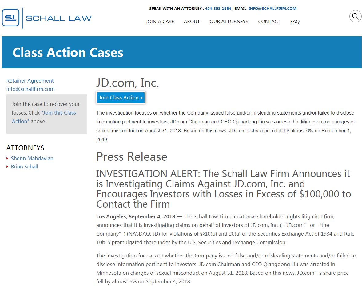 今日,Rosen、Schall、Pomerantz三家美国律师事务所宣布调查京东是否失实披露刘强东案情,并将邀请损失超过10万美元的股民参与调查和可能的集体诉讼。
