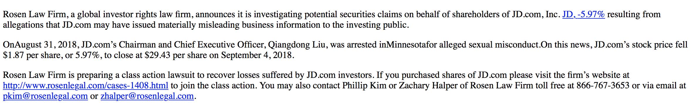 这个新消息对刘强东和京东来说很棘手。在三家律所的公告中,均提到京东董事局主席刘强东因涉嫌性侵被明尼苏达州警方逮捕一事。律所们认为该事件导致京东昨日股价的下跌。在公告中,三家律所呼吁受到波及的股民尽快与之联系,并集结损失金额达到10万美金的股民展开调查甚至可能开展诉讼。