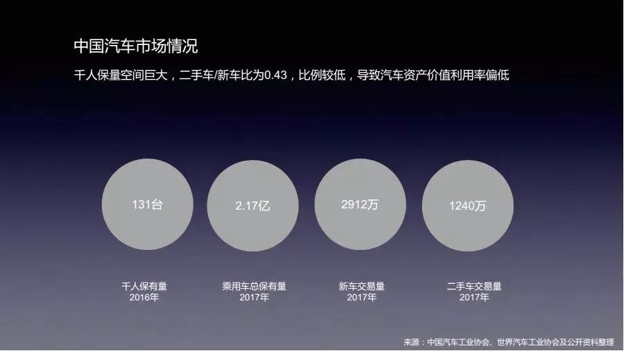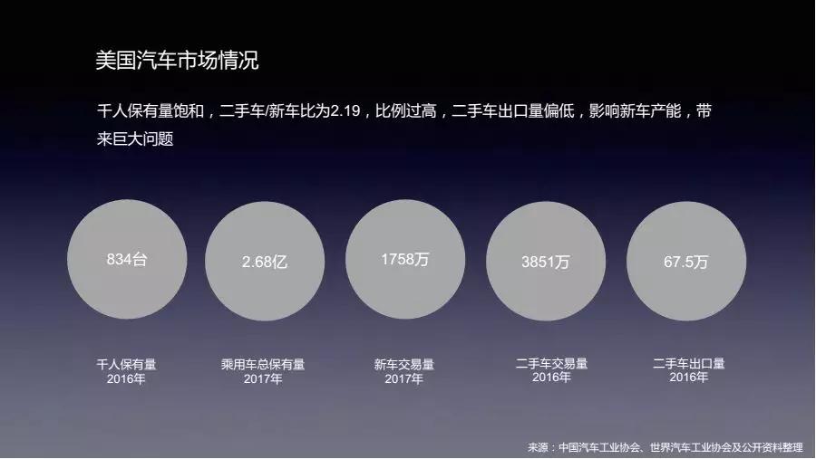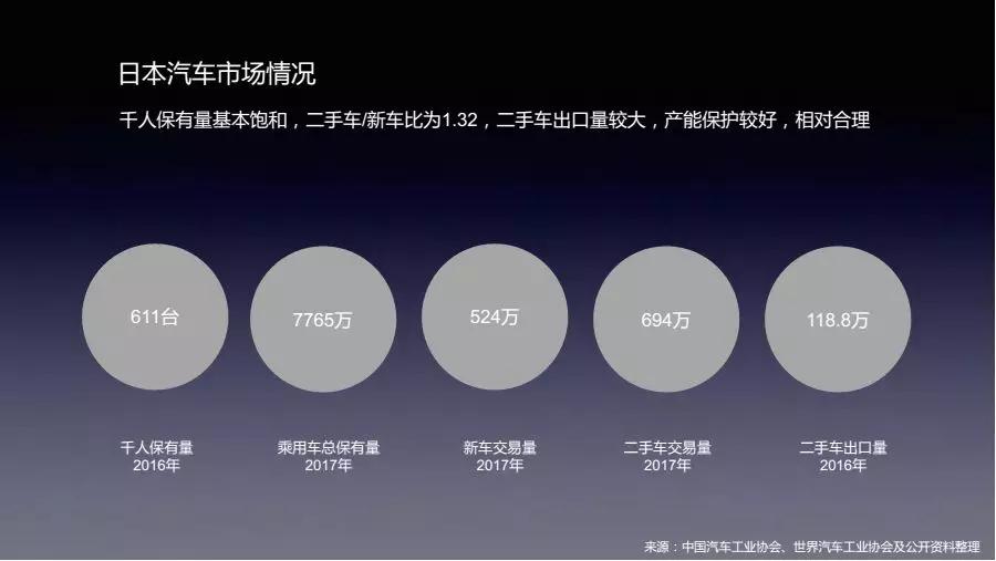 商业就是要知己知彼,我们也希望从美国、日本这些发达的汽车市场看到商业转型的道路和前进的方向。美国的汽车市场情况在2016年的千人保有量达到了834台,2017年的乘用车总保有量是2.68亿,2017年新车交易量是1758万台,2016年二手车交易量是3851万,二手车的出口量是67.5万。千人保有量饱和,二手车和新车的销售比接近于2比1,这个比例偏高,二手车的出口量偏低,市场交易总量是5000多万辆。