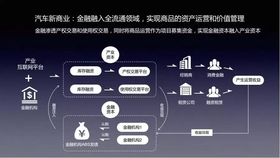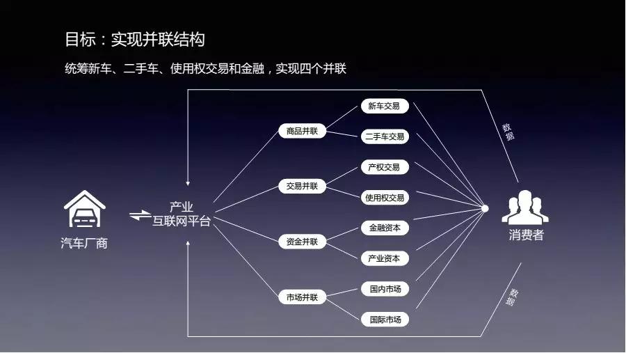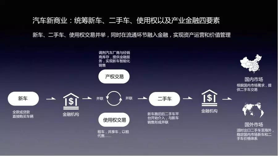 如何实现出行服务?在统筹新车、二手车、使用权以及产业金融四要素,在产品全生命周期中实现产权交易、使用权交易、新车交易和二手车交易,并且实现国内市场和国际市场统筹运作。新的商业理念和逻辑是金融渗透到全流通领域,联系产业资本和金融资本形成一整套资产管理的体系。
