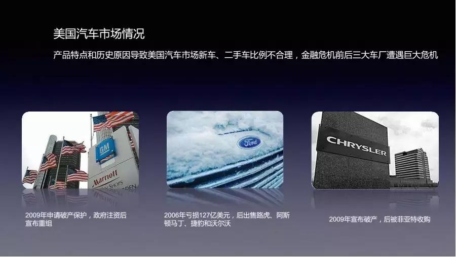 这是一个大概的发展逻辑,好处毋庸置疑,也有不好的地方,比如二手车没有进行很好的存量管理。2006年福特出现了巨大亏损,卖掉了品牌和资产;2009年,通用申请破产保护。这其中原因很多,简单来看,如新车、二手车比重不合理,资产管理运行有缺陷,这也是重要因素之一。美国市场有很强的自我调配和适应能力,经历了商品交易兴起、商品交易饱和、商品使用权交易的过程。属于一个基本的产业发展脉络。