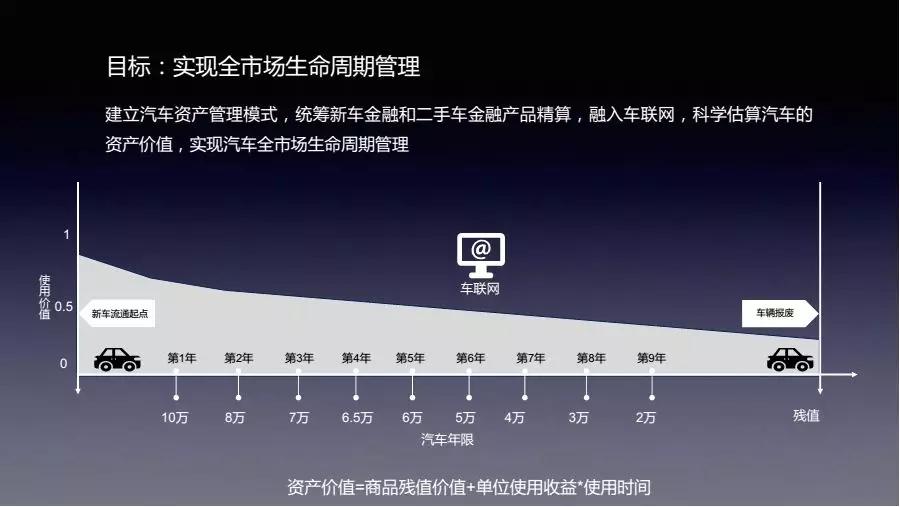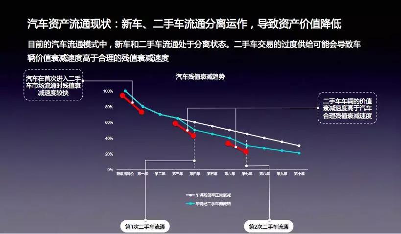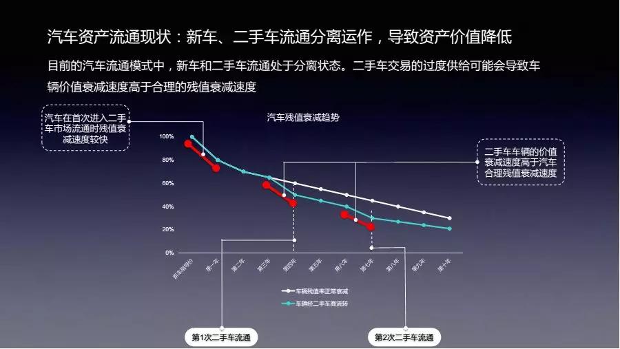 目前的汽车流通模式中,新车、二手车属于分离状态,二手车交易的过度供给可能会导致车辆价值衰减速度高于合理的残值衰减速度,白线部分是合理的衰减,红线是在市场寿命当中是有实际价值低于合理价值的断层。