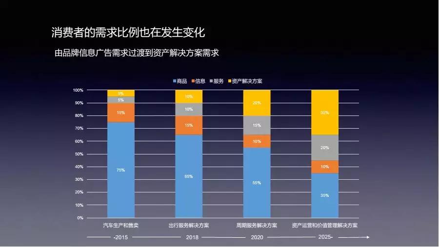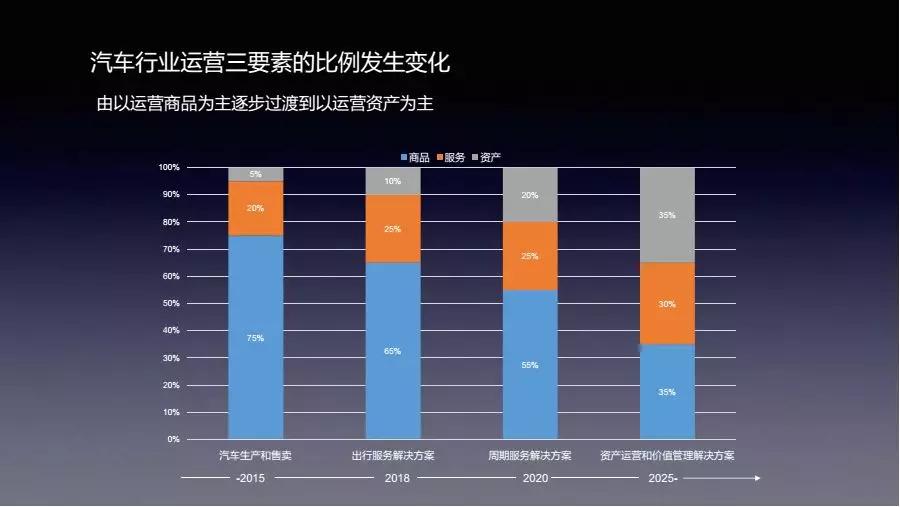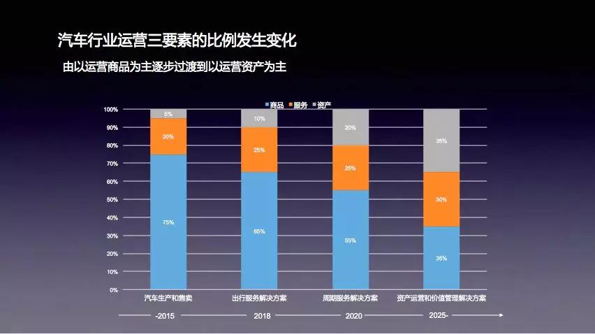 如果汽车行业以运营商品为主逐步过渡到以运营资产为主,我们预估,在未来2015年、2018年、2020年、2025年的时间发展轴内,蓝色代表的商品、橘色代表的服务以及灰色代表的资产,在商业体系当中所占的比重将会发生变化,其中商品权重在缩小,服务权重不断增加,资产运营和资产管理的概念不断强化。以上数值是对三个要素做的一个初步的评判,大概是这样一个模式和比例关系。