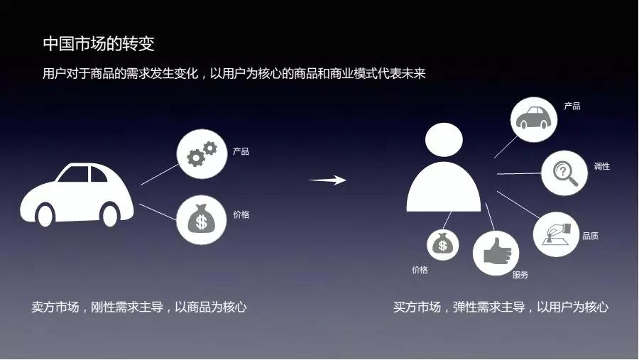 纵观中国近30年以来汽车市场的经济变迁,主要的一个变化是由卖方市场刚性需求主导、以商品为核心的市场和经济逻辑,过渡到了买方市场、弹性需求为特征的、以用户为核心的商业体系。