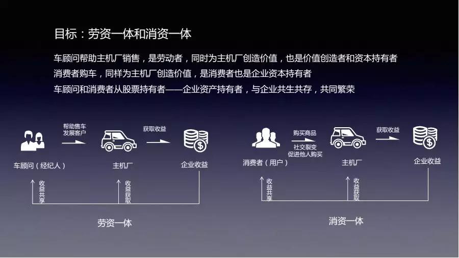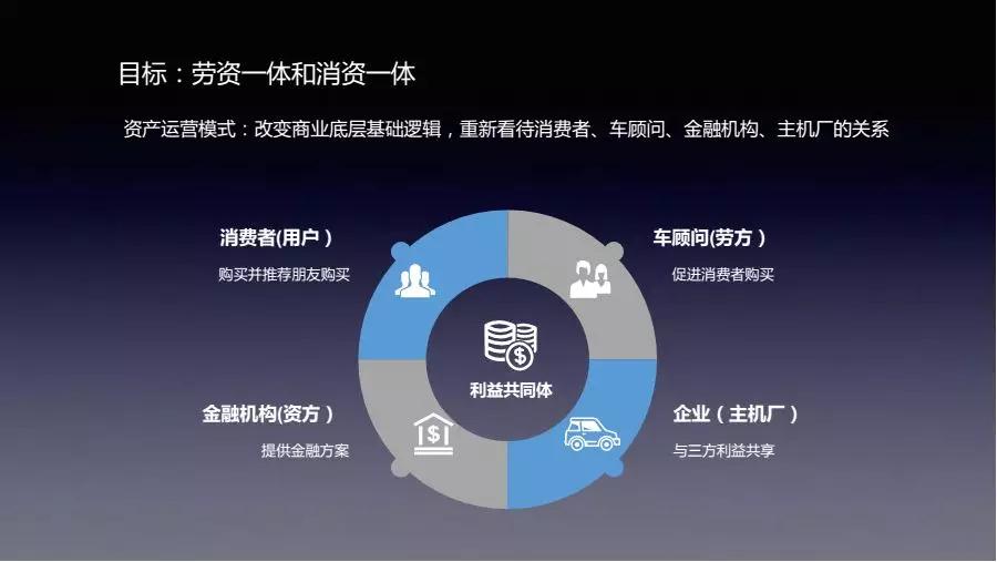 厂和商应该共同参与,经销商也不应当被遗忘。如何让经销商共同参与到产权和使用权交易当中,同步实现出行服务,同步实现资产运营和价值管理,也是当前需要解决的一个问题。我们希望将来厂和商以及最终的商业服务属性能够团结经销商的销售顾问,让他们成为厂商服务用户的一个网络。消费者在买方市场的情况下,其消费行为是对汽车企业莫大的支持,所以我们提出一个概念:“消费即投资”。无论是4S店还是市场的消费体系,希望将来达成劳资一体和消资一体的模式,将与企业共生共存;实现企业的并联结构:统筹新车、二手车、使用权交易和金融;建立资产管理模式,统筹新车金融和二手车金融产品精算,融入车联网,科学估算汽车的资产价值,实现汽车全市场生命周期管理;最终形成一个统筹的体系,我想这是新商业运作的一个基本逻辑。