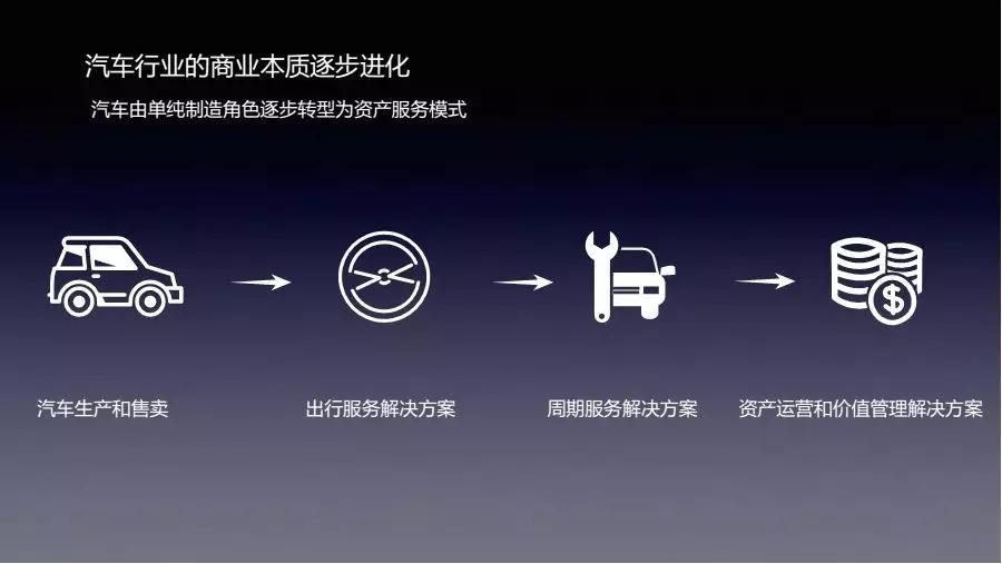 汽车行业的商业本质也因此会发生重大变化,前几位嘉宾讲到电动化、智能化、网联化、共享化,这些所谓的“新四化”,再结合刚才看到的基本市场的发展变化,就如人们常说的:汽车行业要发生百年不遇的商业升级和模式转型。以下是我们的一个判断,汽车行业诸多元素的变化会促成整个汽车产业商业本质的进化。在未来的一段时间内,大概20年左右的时间汽车厂商会由单纯的制造角色逐步转型为资产服务模式。