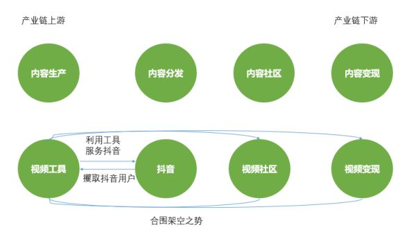 工具线的产品轻且快,火起来也容易。所以如果有一个工具型基因优势强大,同时又有一定社区基础的小公司,抓好抖音的上游和抖音的下游,也有机会来一个空手套白狼,迅速合围抖音,依附抖音这个庞然大物上,不断吸食抖音的用户越长越健壮。