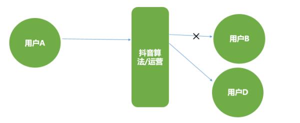 抖音用户A想要和用户B形成内容互动关系,必须经过抖音算法/运营,不一定能形成交流。即使通过了抖音的运营和算法,也可能只将信息传达给D而不是用户B。