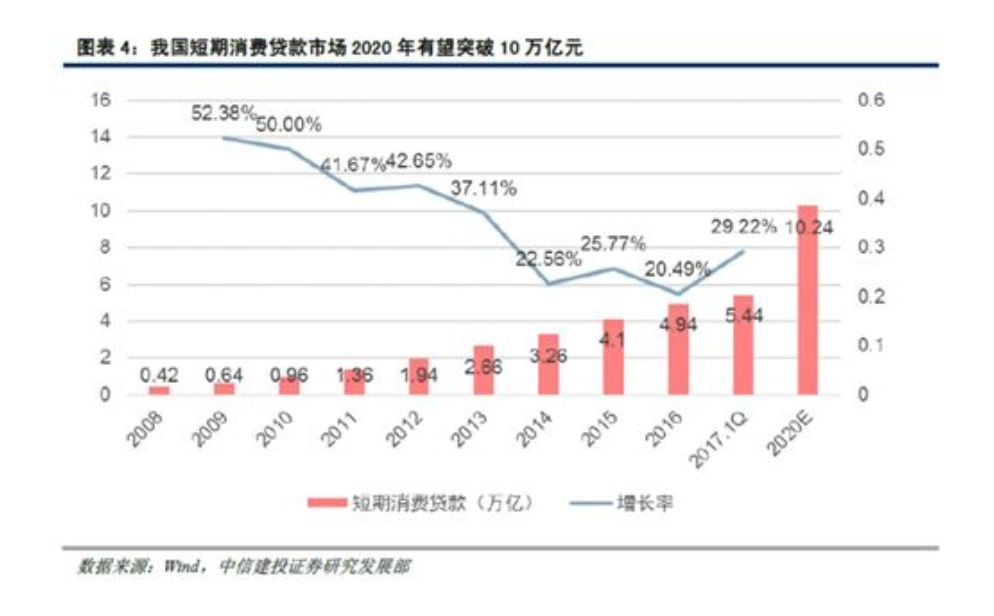 中信建投的研究则显示,我国短期消费贷款市场截至2017年1季度的存量规模达到5.44万亿,根据增长率预计截至2017年底规模将达到6.37万亿,到2020年时行业规模将突破10万亿大关。
