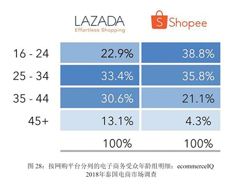 Lazada 用户中,年龄在25岁到34岁之间的人数最多,而Shopee 的用户年龄则相对偏小,其中38.8%的用户年龄在16岁到24岁之间,74%的用户年龄在16至34岁之间。
