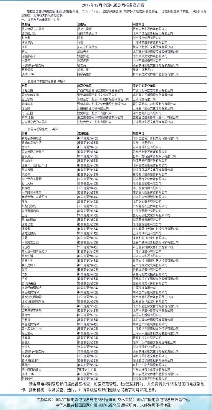 曾有网友特地去国家广播电影电视总局官网,确认了一下电视剧集数变更登记表,仅2017年12月变更集数的电视剧就有54部,其中变化最大的从25集增至60集。