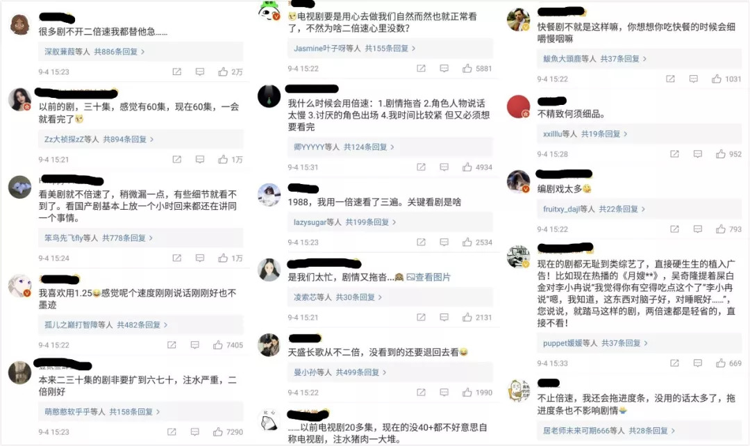 和她想法一样的人不少。在人民网发布的微博「“二倍速”追剧成常态,观众太忙还是剧太差?」下,热门评论多是指责国产剧拖沓、注水严重、太墨迹。