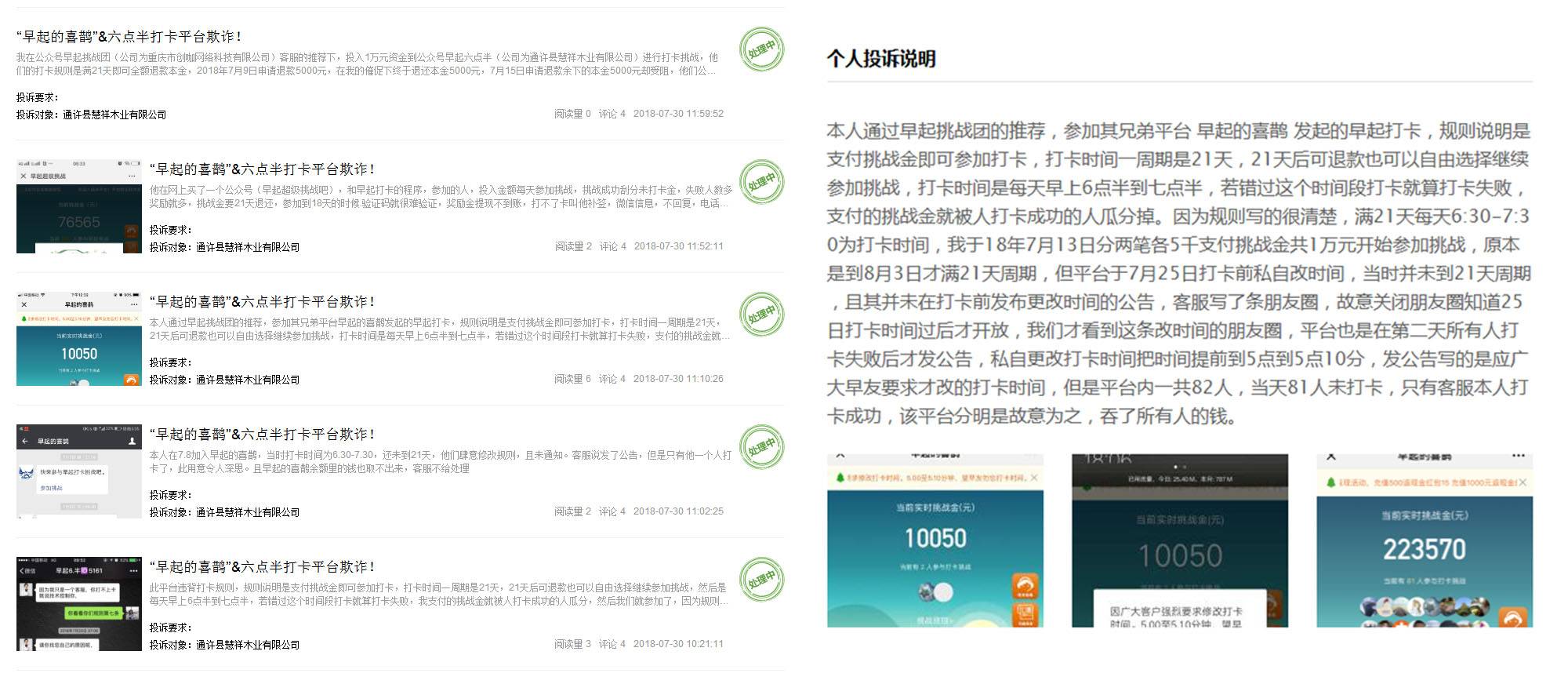 现在在贴吧和聚投诉网都有大量关于早起打卡的投诉内容,《桂林晚报》提到,上海、北京、无锡、桂林等地警方都已经介入调查,可见这种模式的风险将逐渐被大众所认知。