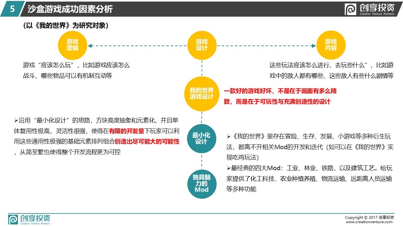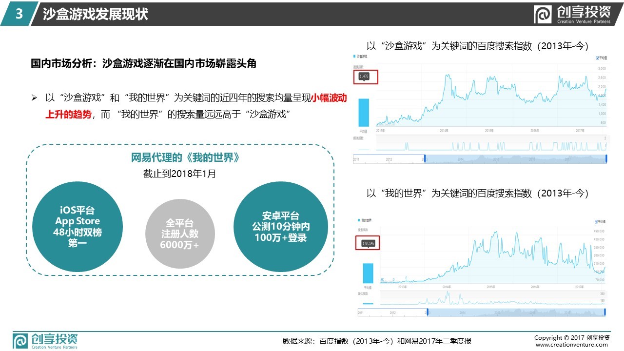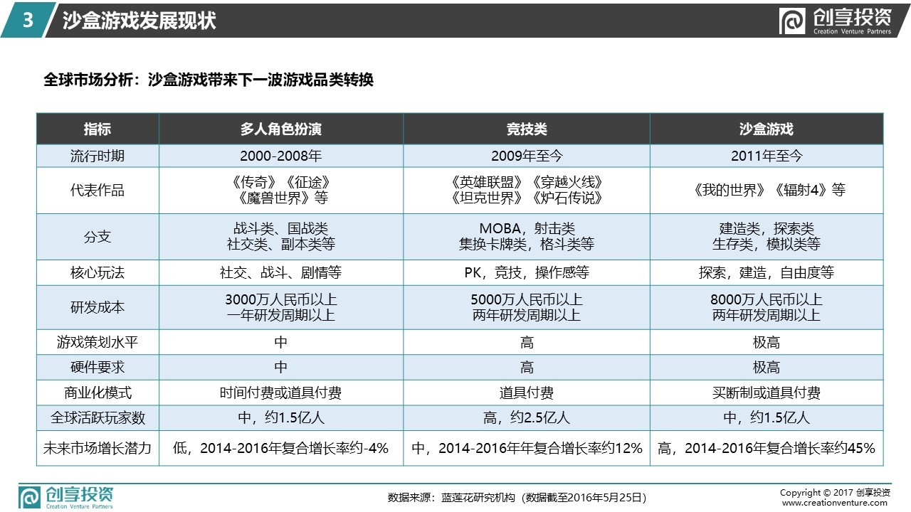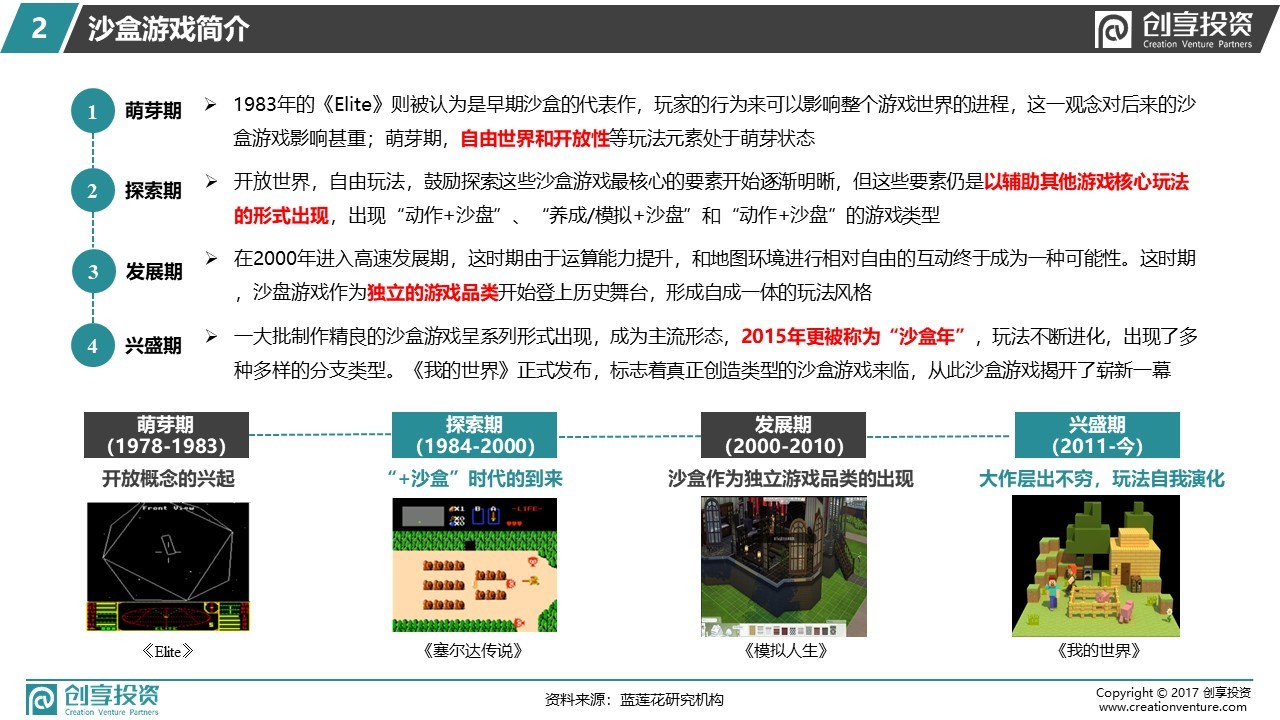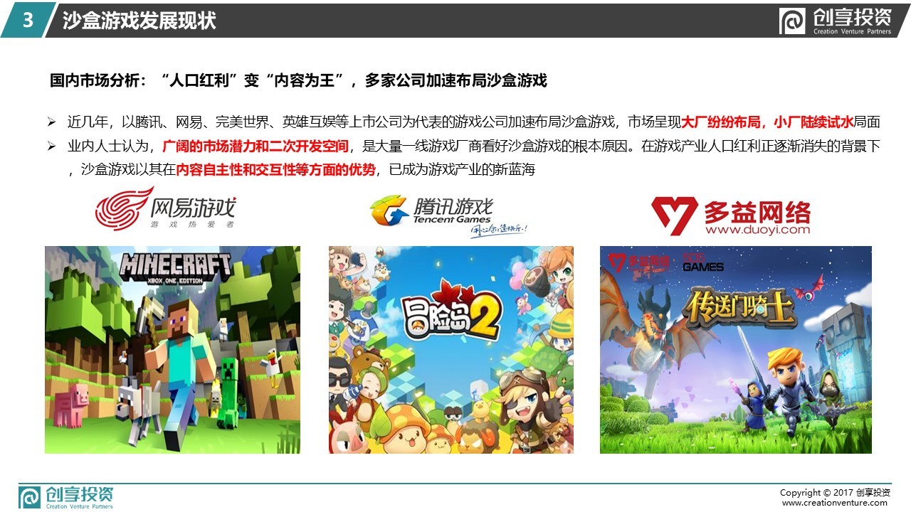 发展现状:纵观游戏发展历史,大约8-10年会迎来一次新的大型游戏品类崛起,从00年大型多人角色扮演游戏,到09年电子竞技游戏的兴起。沙盒游戏的崛起,将会带来游戏行业新一轮的品类转换。