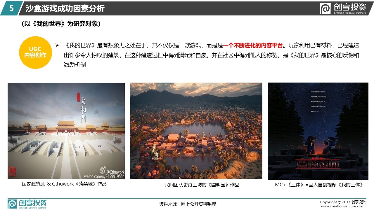 成功因素分析:沙盒游戏凭借其“做你想做的,创造心中的世界”“只有你想不到,没有你做不到”等独特魅力,吸引到多样化玩家,包括专业玩家, KOL玩家以及创造性极强的高端玩家,形成了非常完整的玩家生态群体。