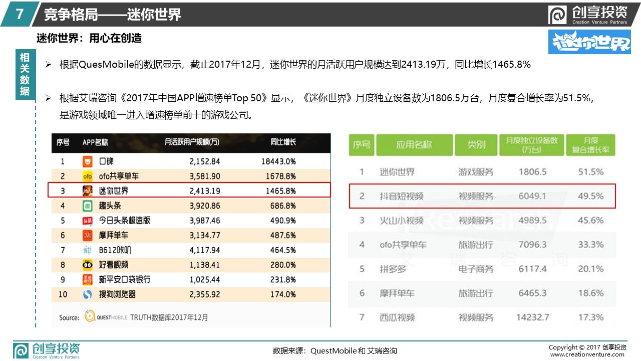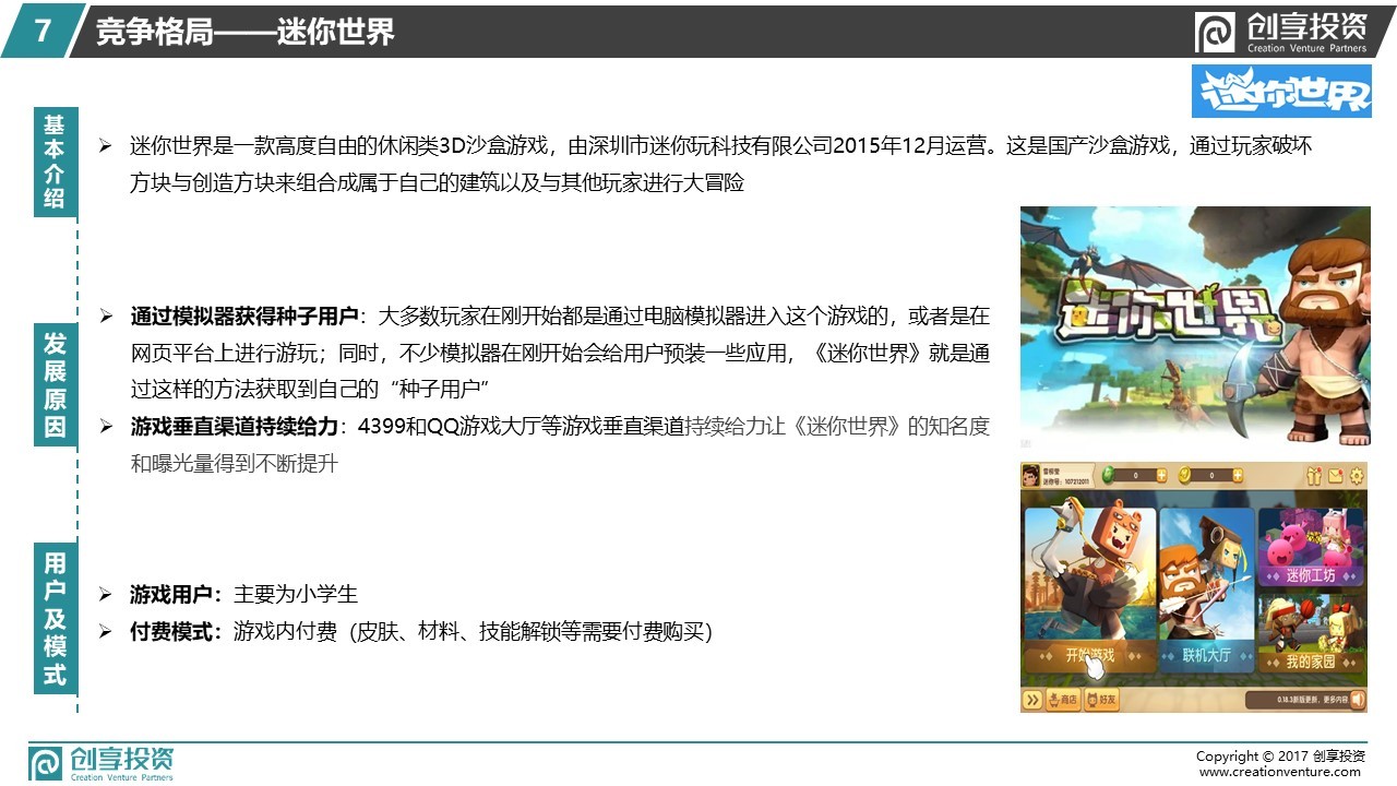 迷你世界是一款国产休闲类3D沙盒游戏,由深圳市迷你玩科技有限公司在15年12月推出。他们通过模拟器,预安装等方式获得种子用户,并借助游戏垂直渠道的持续宣传增大知名度跟曝光量。截至到17年12月,月活跃用户超过2400万,同比增长超1400%,发展势头非常迅猛。
