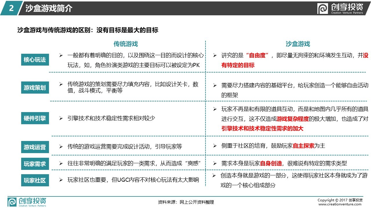 沙盒游戏与传统的游戏类型有很大的区别,主要体现在核心玩法,游戏策划,硬件引擎,游戏运营,玩家需求和UGC/玩家社区。沙盒游戏讲究“自由度”,对引擎技术要求较高,注重于玩家社区的培养,鼓励玩家们自主探索自主创造。