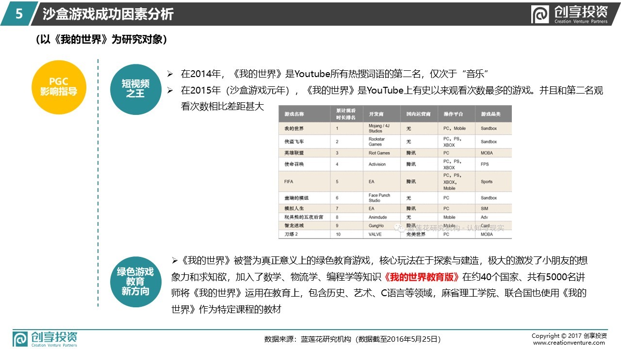 PGC内容的影响指导,让《我的世界》在短视频分享及绿色教育方面非常成功。利用游戏中的模组、人物、建筑可以模拟出许多有剧情故事的短剧,上传视频平台可以与众多玩家一同分享,2015年《我的游戏》成为youtube平台上有史以来观看次数最多的游戏。