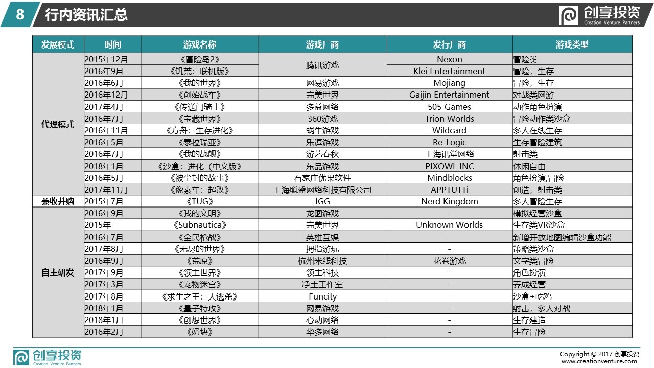 整体沙盒游戏市场呈现大型厂商加速布局,小型厂商下海试水的局面。在游戏人口红利不断消失的背景下,沙盒游戏以其内容创造的强势优势,成为游戏产业的蓝海。目前大厂商同步进行代理+研发双管齐下,未来沙盒游戏的本土化及差异化运营成为游戏公司的关键。