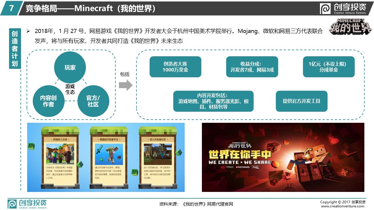 18年初,网易提出“创造者计划”,开始全面扶持《我的世界》玩家、创造者,希望通过玩家们的不断创造,共同营造良好的游戏生态。这也是《我的世界》能持续吸引众多玩家的主要原因。下图是其整个产业链图谱,涉及游戏发行商,代理商,内容开发,社区论坛等多个领域。