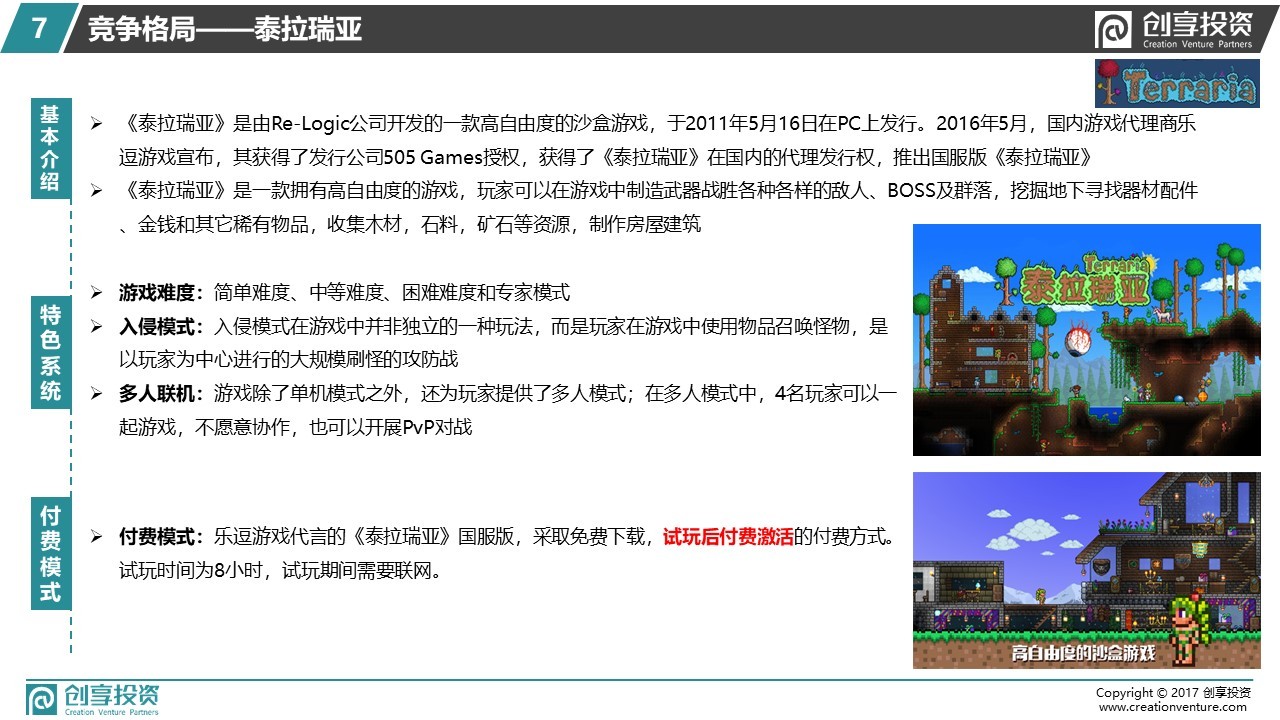 泰拉瑞亚是由Re-logic公司开发的一款高自由度的沙盒游戏,11年在PC上发行。16年5月,乐逗游戏获得国内代理发行权,推出国服版《泰拉瑞亚》。