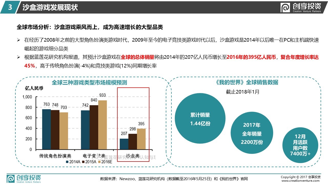 沙盒游戏目前成为14以后唯一在PC跟主机端快速崛起的游戏细分品类,全球总体销量复合年度增长率高达45%;其中沙盒游戏代表作《我的世界》,截至18年1月,全球销量已达到1.44亿份,月活跃用户突破7400万,推动全球沙盒游戏高速发展。
