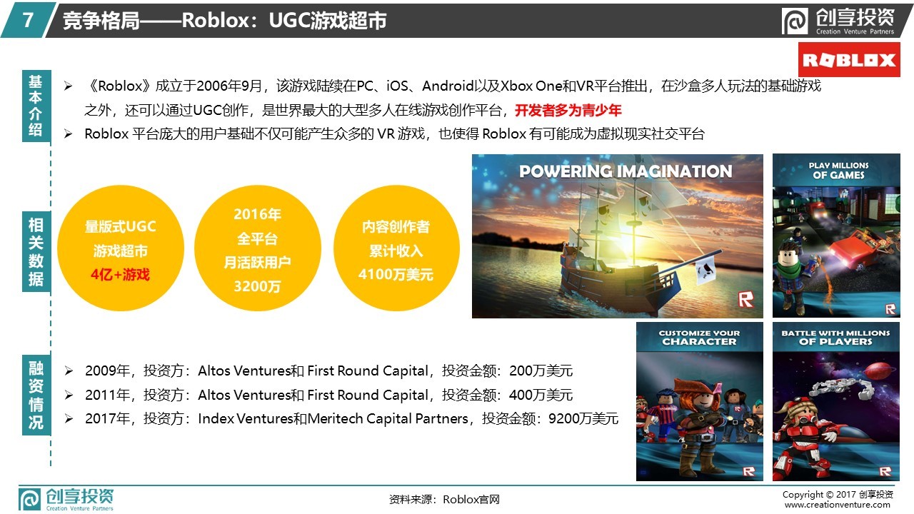 《Roblox》成立于06年9月,游戏陆续在PC,移动端,Xbox和VR平台推出。在沙盒多人基础玩法之上,还支持多样化的UGC游戏创作;目前平台上涵括4亿+游戏,是世界最大的大型多人在线游戏创作平台,如同一个UGC的游戏超市。