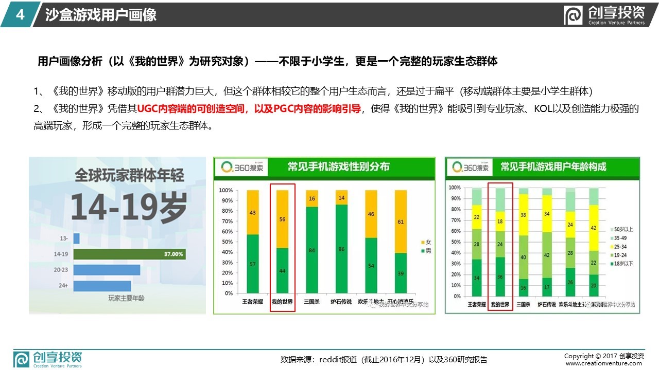 用户画像分析:沙盒游戏全球玩家群体14-19岁 占37% ,20岁以上群体占比高于37%,国内玩家中,女性更偏爱手游版《我的世界》,而年龄分布中18岁以下群体比重最大,占36%。整体游戏玩家较为年轻,用户群潜力巨大。