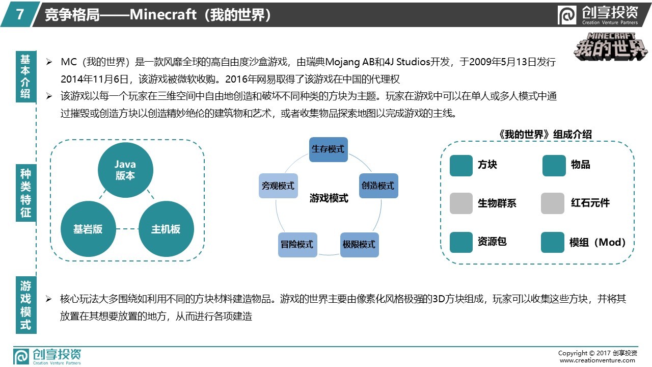 MC(我的世界),由瑞典Mojang AB和4J Studios开发,09年正式发行,14年被微软收购,16年网易获得中国的游戏代理权。该游戏以每个玩家在三维空间中自由地创造和破坏不同种类的方块为主题,相当于电子游戏界的乐高玩具。