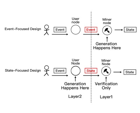 我们这个 Layer1 它有什么区别呢?首先第一点,当这个交易进行的时候,state 已经进行了。我们可以看到中间那个图,我必须要去挖这个块以后,我才最终确定了最终状态 state 是什么?也就是说,它最终上链的时候是不确定的。