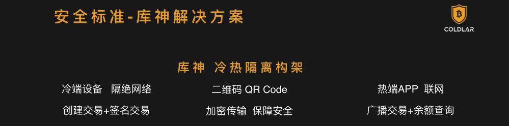 库神创建了一个解决方案,首先是冷热隔离,我们做了一个硬件设备,这个硬件设备是完全离线,配合这个硬件设备使用的还有个APP,这个硬件设备主要完成交易的创建以及签名,通过二维码加密通信方式,把签名后的信息通过 APP 发送到区块链上。这个过程就可以有效的来杜绝网络黑客的攻击。