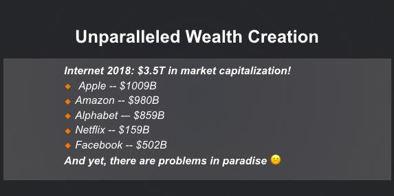 大家可以看上面那张图。虽然这些数据不是最新的,因为我是在上一周的时候准备的PPT。大家可以看到,现在苹果、亚马逊的市值都超过了万亿美元,排在第三的 Alphabet 也达到了 8590 万美元,所以说互联网这个行业真的创造了很多财富。