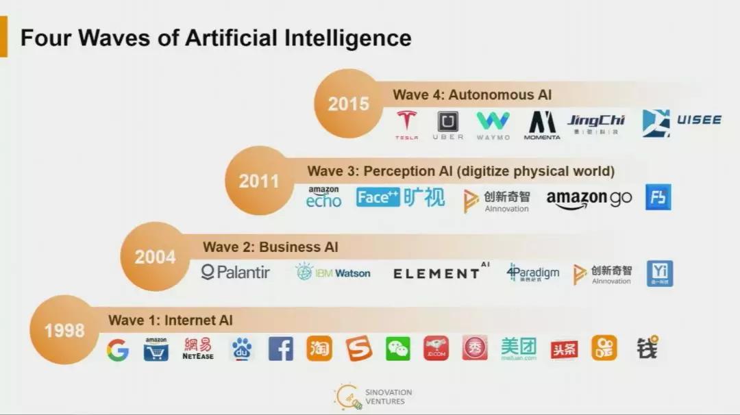 在这本书里,开复老师将人工智能革命分为四个阶段:互联网智能化(Internet AI)、商业智能化(business AI)、实体世界智能化(perception AI)、自主智能化(autonomous AI)。