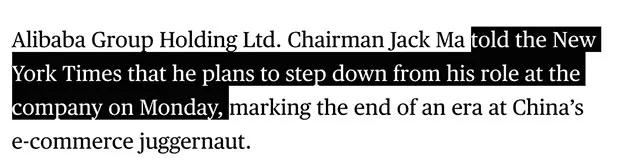 而在其他媒体的转载中,这段话就被默认是马云在接受《纽约时报》采访时的言论,彭博社干脆直接说「马云告诉《纽约时报》」他要在周一辞职。