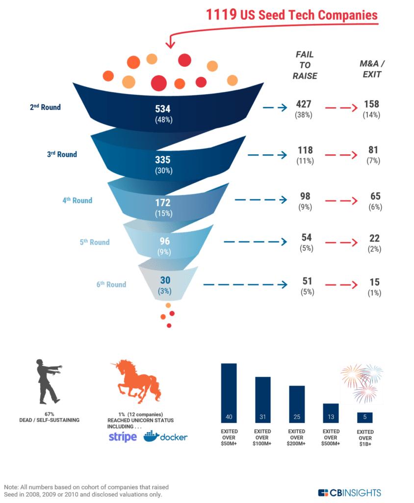 在我们最新的研究中,我们追踪了超过1,100家在2008 -2010年在美国种子轮的科技公司。不到一半,即48%,设法筹集了第二轮资金。每前进一轮,得到新的资本注入、稳步向前的公司都会再少一些。只有15%的公司继续筹集第四轮资金,这通常与C轮融资相对应。