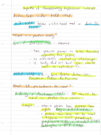 我靠写问答题答案学到了这一切,一遍遍地写。我每天都不止写一题。只要我在看东西的时候都是在写东西。我的阅读是由我要在问答题里面写什么东西来决定的。比方说,如果我在学习《侵权行为法》,问题是“在什么情况下原告纯粹经济损失的案例可以上诉成功?”然后那一天我的阅读都是冲着回答这一问题进行的。只要我在一篇期刊文章中找到了一个相关点,我就会把它整合进回答里面。当然这种做法未必适合于所有的科目!