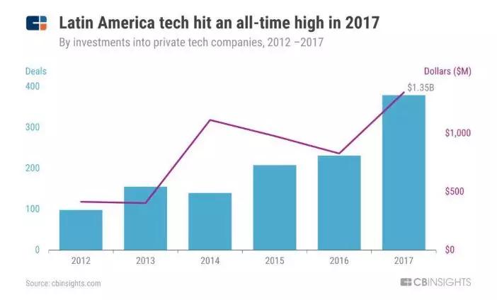 2017年是拉美创投显著增长的一年,创下了11亿美元的历史新高。有25家全球投资者在拉丁美洲进行了首次投资,包括软银、TPG的The Rise Fund、Telstra Ventures、Rethink Education等。