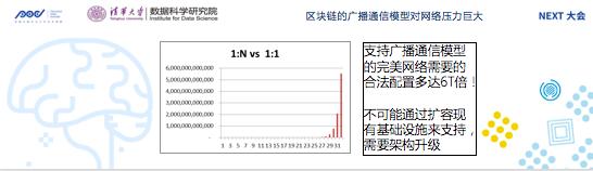 第四,区块链对网络及数据基础设施提出了巨大的挑战。基于广播的通信模型,分布式的共识对网络产生了巨大挑战。区块链的广播通信模型对网络压力巨大。支持广播通信模型的完美网络需要的合法配置多达 6T 倍。这是不可能通过扩容现有基础设施就可以达到的,需要架构升级。
