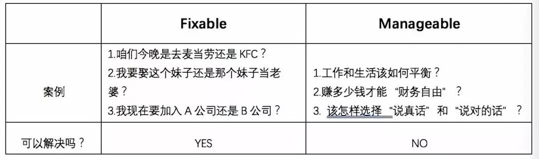 这个世界上分别存在着两类问题,一类叫“Fixable(可以解决的)问题”;另一类叫“Manageable(无法解决,但可以被管理的)问题”。
