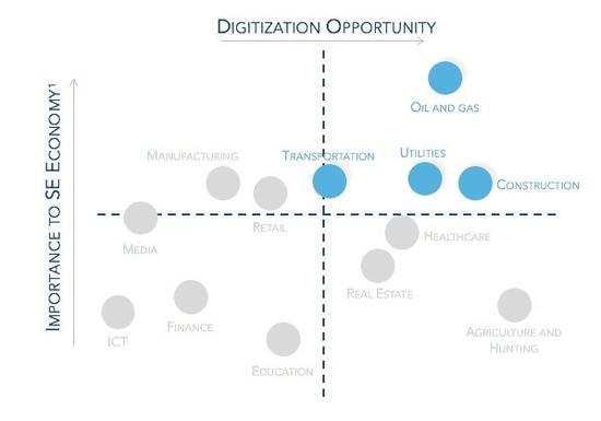 本文使用了美国经济分析局东南地区的地理定义,以及德克萨斯州来分析上面的图表。然后根据麦肯锡(McKinsey)的研究,将其与某个行业的“数字化”机遇进行比较。